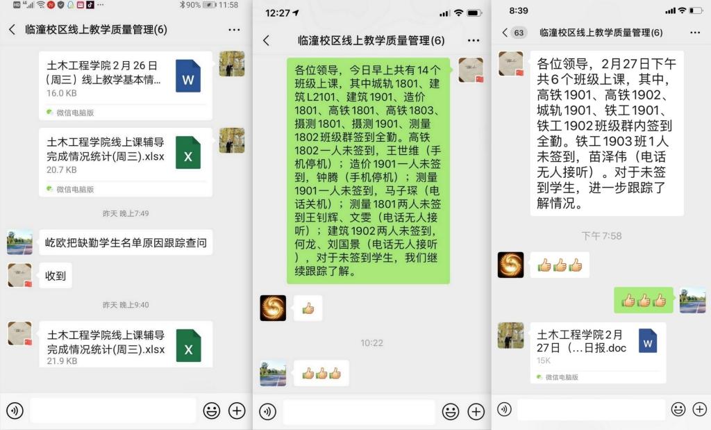 同时,校区线上教学工作实行每日“两报告”制度,在校区线上教学质量保障微信群,教务科长要报告当日线上教学开展情况、教学任务完成情况、存在问题及改进措施;学工办主任要报告当日学生出勤情况、存在问题及改进措施。
