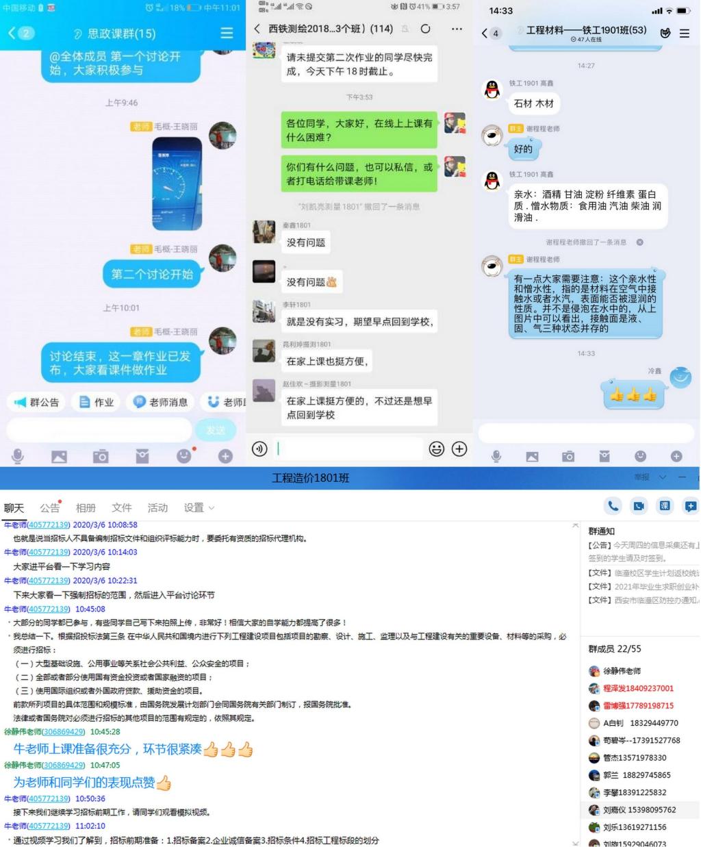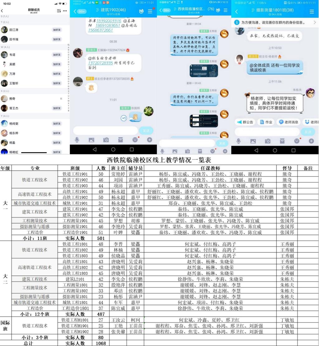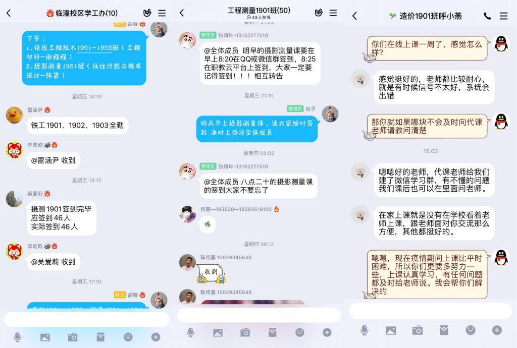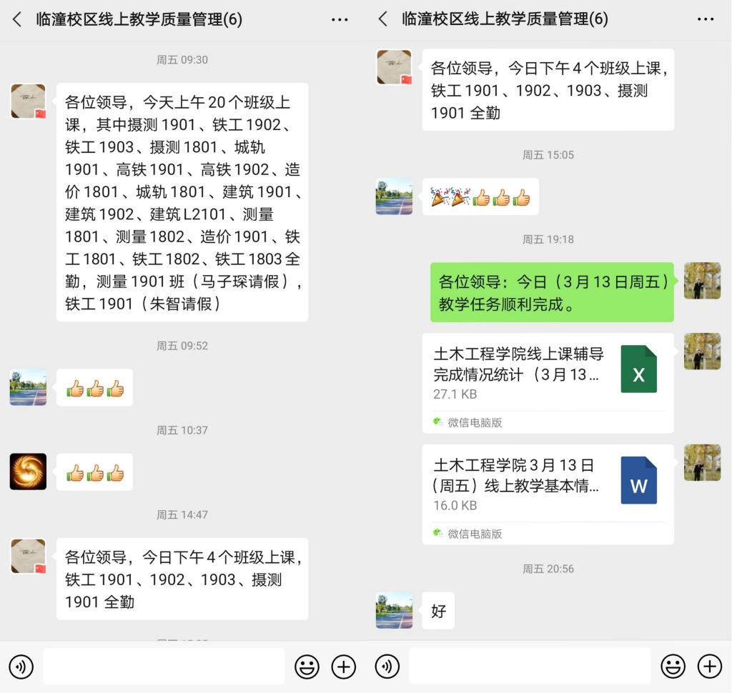 坚持“两报告”制度,确保教学动态管理精准高效。每天晚上8:00以前,通过校区教学质量管理微信群,教务科长向校区领导汇报当日线上教学开展情况;学工办主任汇报当日学生出勤情况。同时,校区根据当日教学和学生管理中存在的问题,及时商讨并提出改进措施,并积极推广先进经验,真正达到教学与学生管理“日检查、日报告、日整改”有机结合、有的放矢、精准施策。