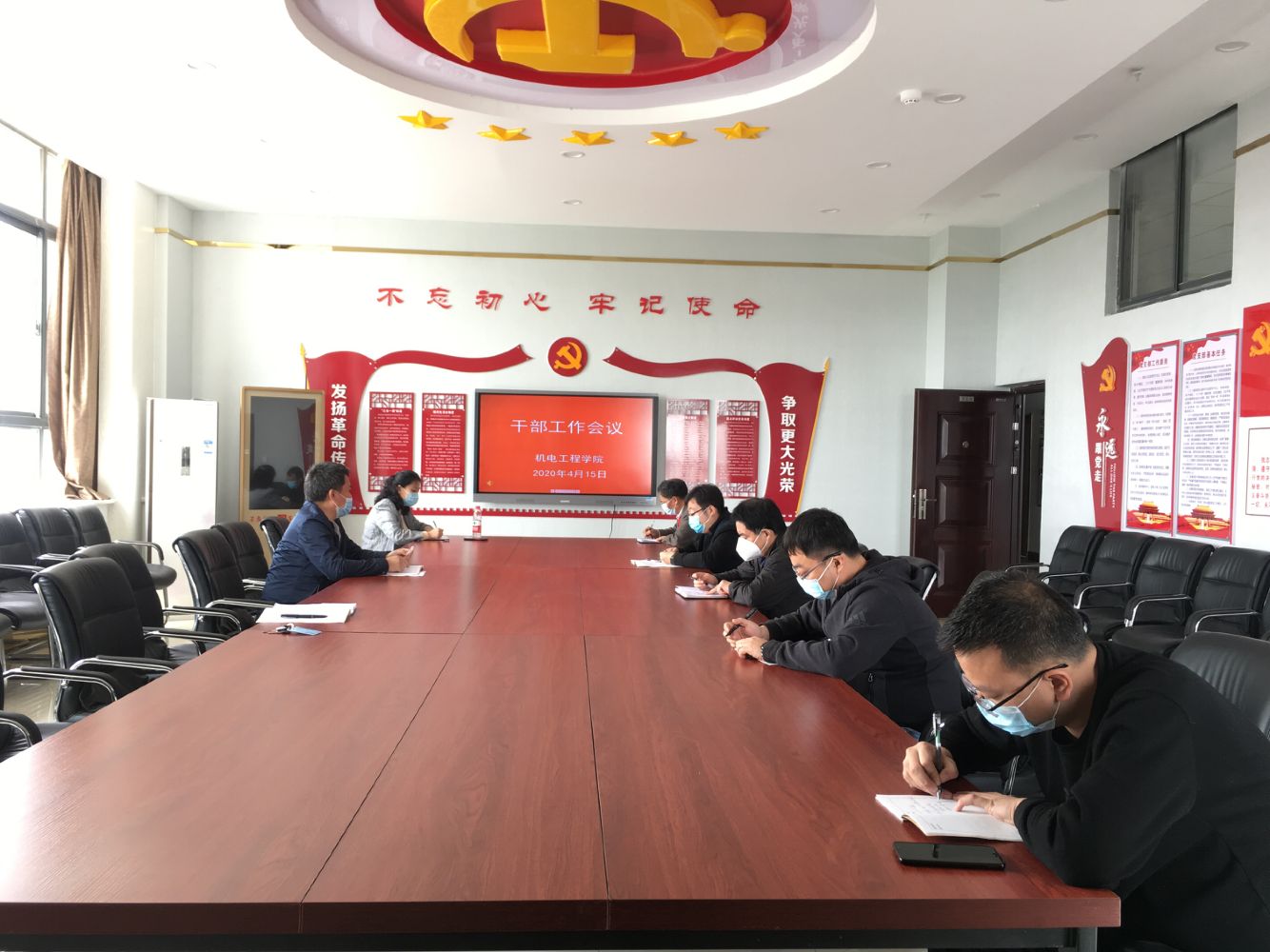 为贯彻落实学院2020年干部大会精神,部署新学期工作,4月15日,机电工程学院召开落实学院2020年干部大会精神暨新学期工作部署会,学习讨论学院领导讲话精神,对新学期重点工作做了安排。会议由机电工程学院院长代礼前主持。全体副科级及以上干部参加会议。