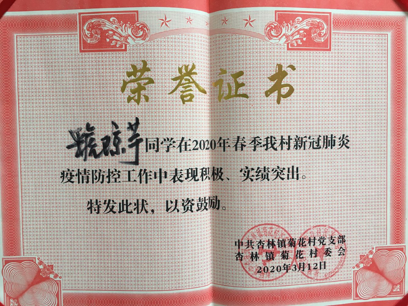 自疫情防控工作启动以来,菊花村村干部日夜连轴转。为缓解大家紧张的工作节奏,分担任务,虢琼芋同学第一时间响应号召,主动请缨参加大学生志愿服务青年突击队。工作内容包括宣传防疫知识和注意事项,协同值班人员做好出入村车辆登记、消毒,人员体温检测,排查外来人员,无关人员和车辆劝返等。事无巨细,繁琐但严肃,日复一日,虢琼芋同学始终以饱满的精神状态和细致入微的工作态度完成了各项工作。他在自己的微信朋友圈写到:“在疫情面前,我们没有一个人能置身事外,做好志愿服务工作,这是对自己负责,对他人负责,更是对社会、对国家的支持。”这是纯粹的赤子之心的流露,也是强烈责任心的由衷表达。