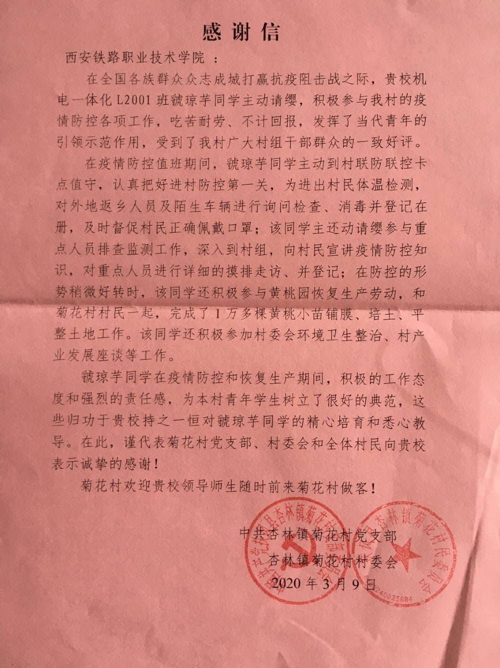 5月初,一封因为疫情滞留些许日子的感谢信送到了机电工程学院,宝鸡市扶风县杏林镇菊花村在感谢信中介绍了永利官网学生虢琼芋助战家乡抗疫的先进事迹,表扬了该同学敢于作为的精神。