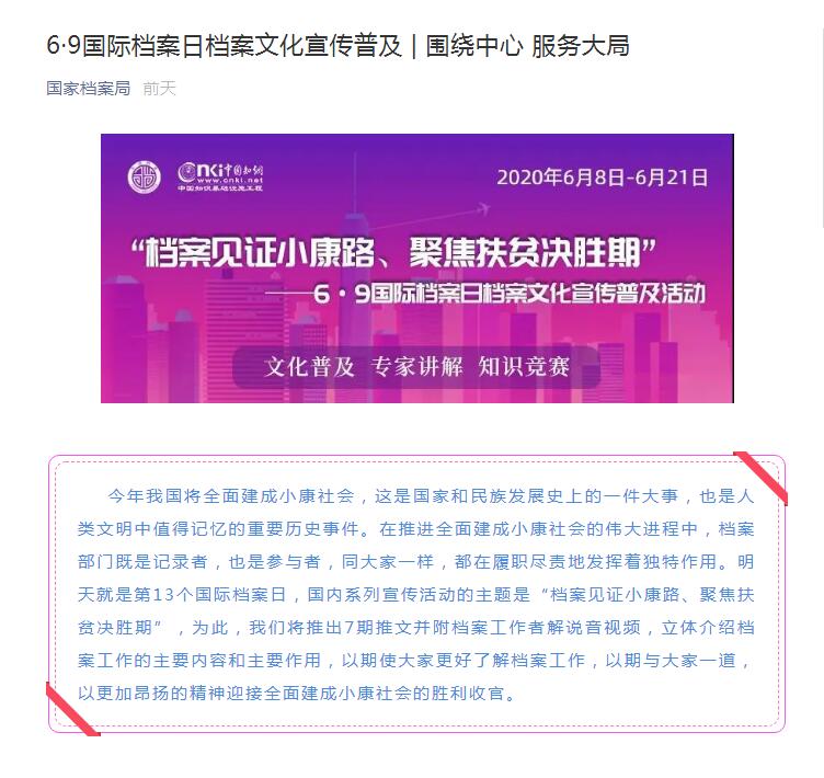 通过线上宣传活动,以文字、照片、视频的方式展示了档案工作在脱贫攻坚中的独特作用与贡献,让永利官网师生认识档案价值、感受档案魅力,了解档案在服务社会、服务民生中的积极作用。