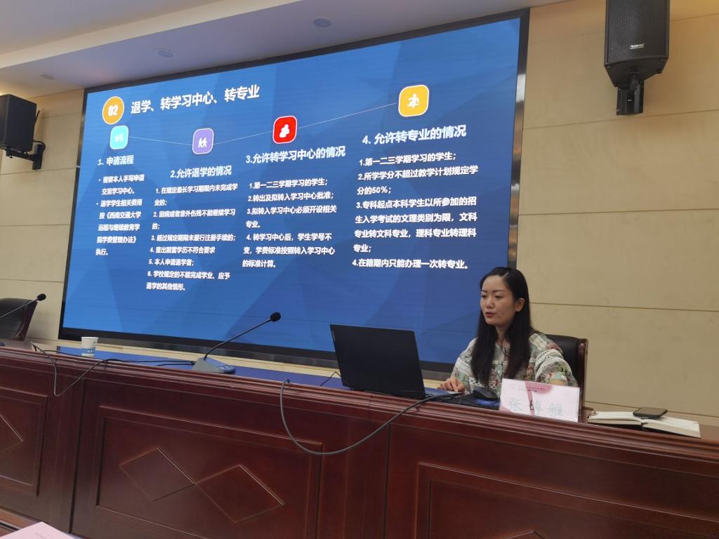 教务科张博雅科长对西南交大出台的一系列管理文件包括:学籍管理、统考问答、平时作业、教学管理、期末考试、毕业设计、学位申请等方面的内容逐一进行解读学习,对班主任在网上如何完成日常管理工作进行了演示,同时部署了本学期班主任的重点任务。