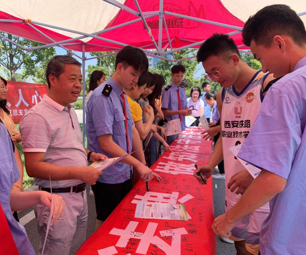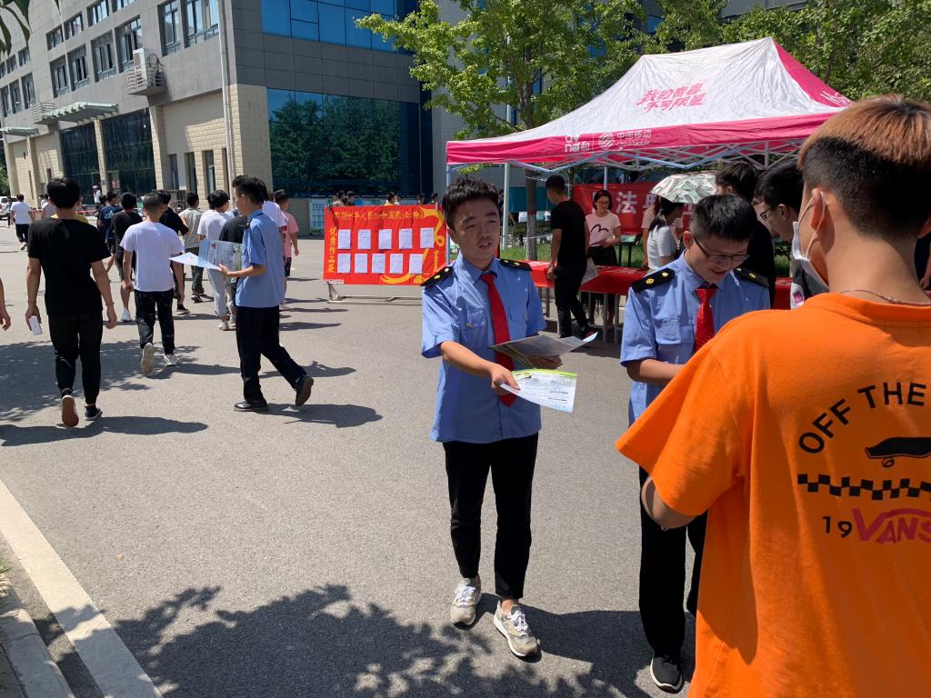 9月2日午间,马克思主义学院全体教师指导学习社成员在餐饮中心楼前开展了《民法典》校园宣传活动。学习社成员创作的学习《民法典》书画作品和学习感想优秀征文吸引了过往的师生,学习社成员向师生发放《民法典——人民美好生活的法治保障》宣传单,向他们讲解什么是《民法典》、《民法典》值得师生关注的亮点内容,并邀请大家在宣传横幅上签名,参与到学法用法的活动中来。