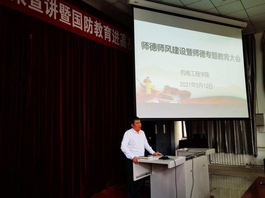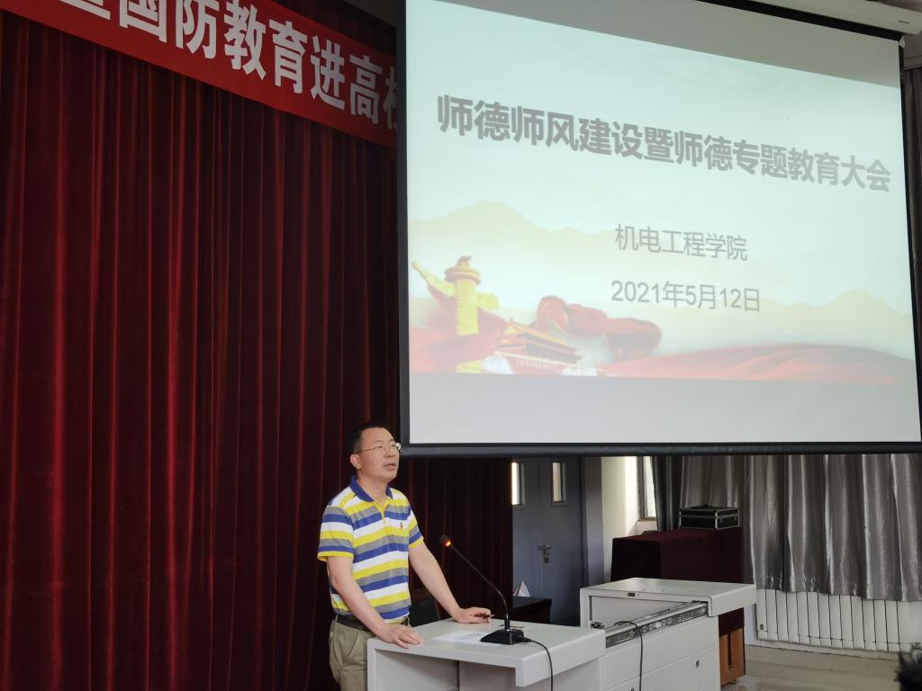 为加强永利官网师德师风建设,坚决落实教师职业行为十项准则要求,进一步强化思想政治素质和职业道德观念,5月12日下午,机电工程学院在一楼阶梯教室召开了师德师风建设暨师德专题教育大会。会议由办公室主任邵泽宽主持。