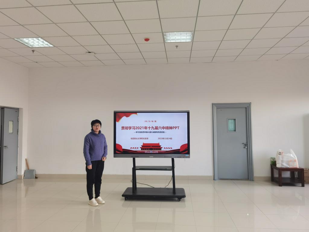 首先,宣传委员黄旌芮从十九届六中全会介绍、党的百年奋斗的重大成就、党的百年奋斗的历史经验、不忘初心实现第二个百年奋斗目标的新的赶考之路等四个方面带领大家一起全面系统地学习了党的十九届六中全会精神。