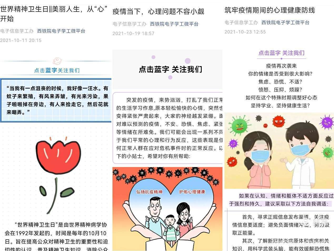 一是深入开展心理健康知识宣传。为进一步科普心理健康知识,活动期间,各二级学院利用美篇、公众号等形式定期宣传普及心理健康知识,引导大学生树立积极向上的阳光心态,学习科学的心理调适方法。