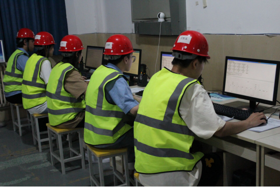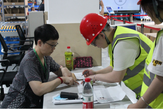 下午,学生在智慧物流实训中心进行线下实操考核,学生戴安全帽,列队整齐,整装待发,完成录单,并通过手持终端单独完成入库、理货、搬运、整理、上架、下架、出库等多项物流作业,中物联对考试采用远程监控,指派西安外事学院罗宁担任考评员,对学生完成情况进行全程现场考评。