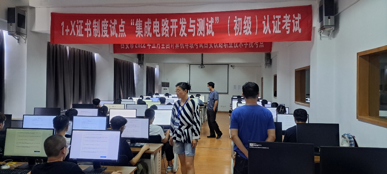 在学校领导高度重视,电子信息学院精心组织及现代教育技术中心等部门的大力支持下,圆满完成本次考试的各项工作。考务人员严格按照教育部相关要求,进行考点建设、场地设施建设、制度建设及人员组织安排等一系列考前准备工作,考试实行线上全程监考及录频,确保考场的正常运行。考试合格的学生将获得由杭州朗迅科技有限公司颁发的集成电路开发与测试职业技能等级(初级)证书。