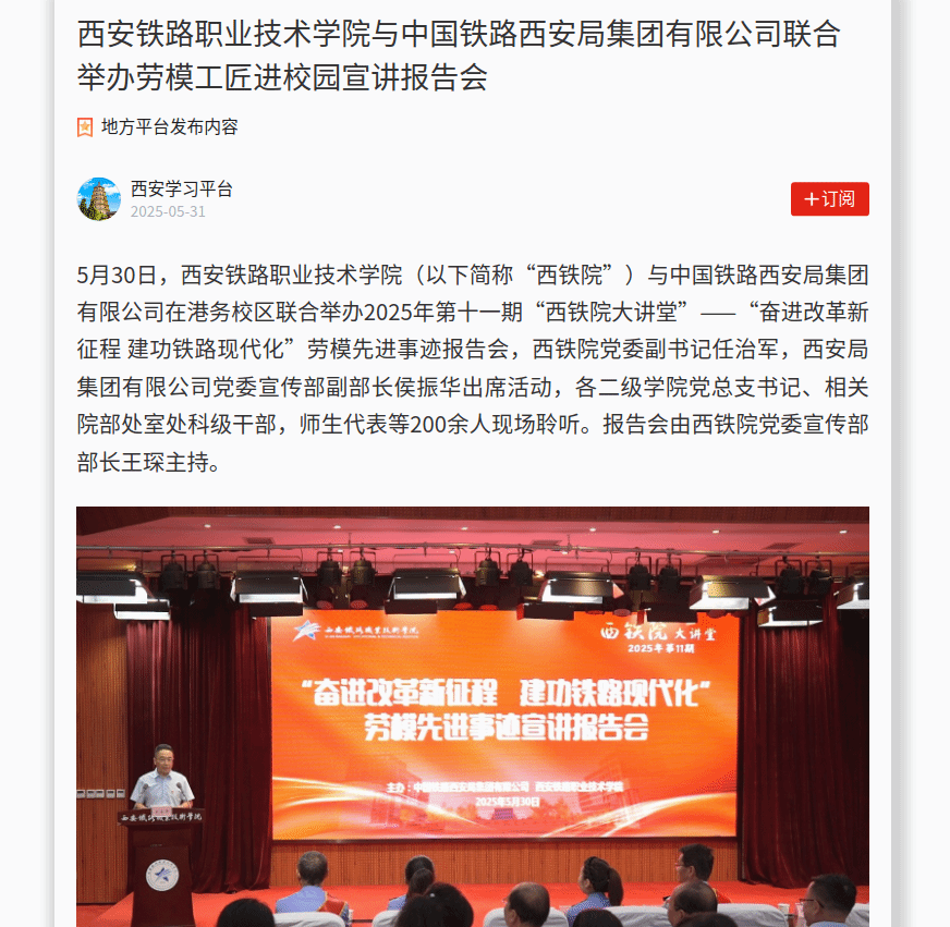 304am永利集团官网与中国铁路西安局集团有限公司联合举办劳模工匠进校园宣讲报告会