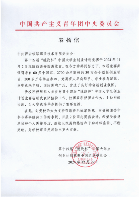 近日,永利官网收到第十四届“挑战杯”中国大学生创业计划竞赛全国组织委员会发来的表扬信,对永利官网团委及赛事期间接待省级代表团工作的李妮、田辰2位同志提出表扬。