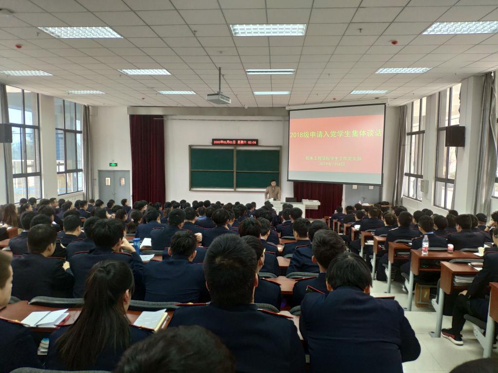 1月8日,机电工程学院学生工作党支部召开2018级申请入党学生集体谈话会。学生工作党支部组织委员谷茂庆对2018级278名申请入党学生进行了集体谈话。