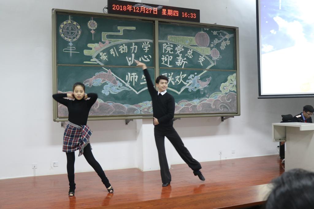 本次联欢会节目丰富,类型多样。杨国庆同学的歌曲《最美的歌儿唱给妈妈》,闫星辰和杨澍同学的歌曲《悟空》,李诚和沙建军彝族歌曲《流离者》,文淑蔓和李思萌同学的吉他弹唱英文歌曲《As Long As You Love Me》,赵頔源和王展鹏同学动感韵律的国标舞,马瑶同学温婉柔美的民族舞、王嘉伟和黄骏豪等同学的小品《一念天堂》,曹子凡和罗登同学的相声《选择题》等节目赢得了师生们的阵阵掌声。特别令人瞩目的是具有牵引特色的诗朗诵表演,李宏菱、柏承宇二位老师的配乐朗诵《太行山上的新愚公》,饱含深情地讲述了李保国先生的先进事迹,让观众大为感动。任安萍、朱亚男、王晓琴等老师的《我们都有一个陆地飞翔的梦想》,从牵引人的角度出发,抒发了为祖国铁道交通事业努力奋斗的真挚情感,引发了观众强烈的情感共鸣。联欢会的压轴节目是闫喜洋、王郭鹏等同学朗诵《新年来了》,表达了对2019年的渴望和展望,呼唤人们积极投入2019,不负韶华,开拓前进。