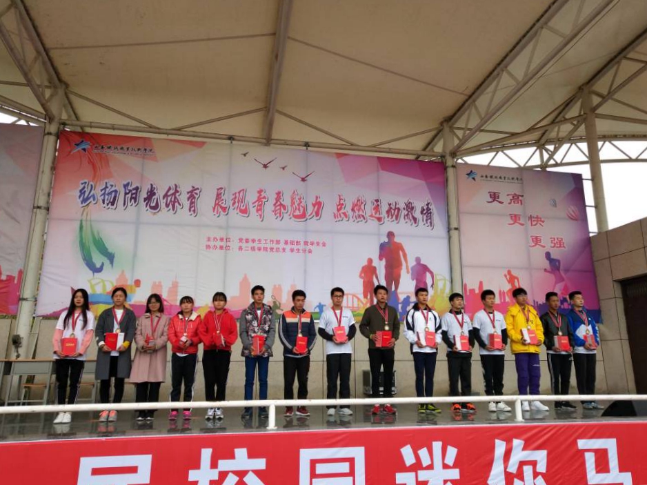 11月17日,由党委学生工作部、基础部主办,各二级学院党总支协办,院学生会承办的学院第一届校园迷你马拉松比赛在港务校区运动场开赛。党委学生工作部部长郭小莉、副部长高阿联、基础部主任孙明魁、基础部体育部副部长张建龙参加了开赛仪式。郭小莉为本届校园迷你马拉松成功举办致辞。