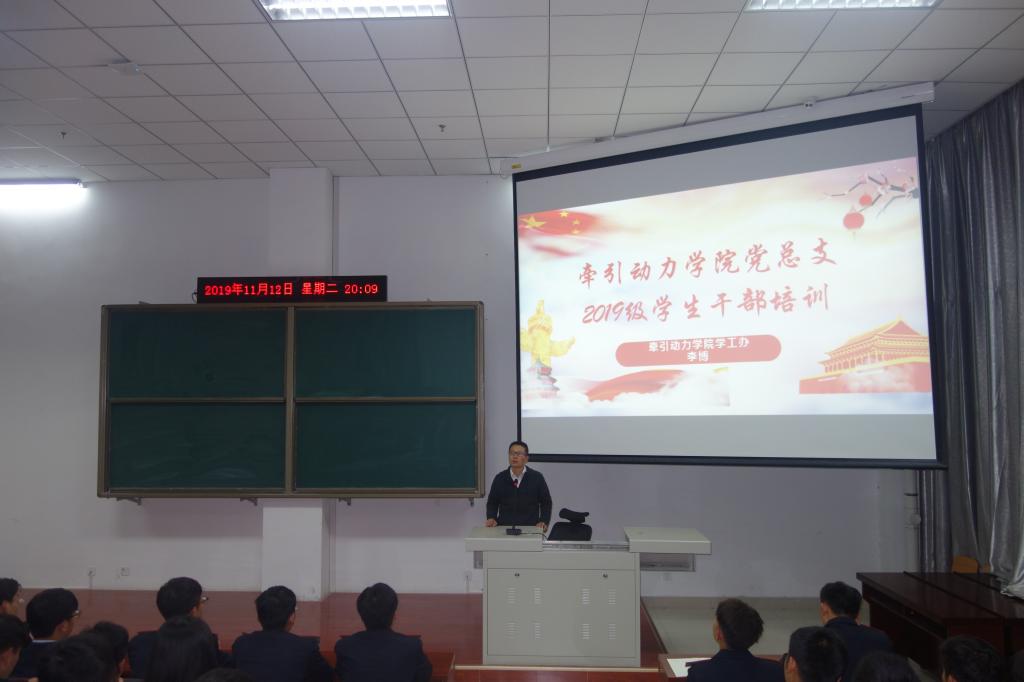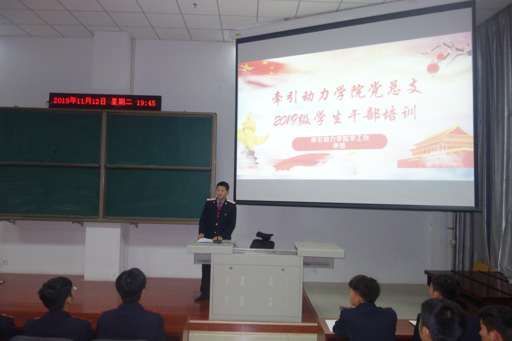 为了提高学生干部的思想认识,增强学生干部的综合素质和工作能力,更好的开展学生工作,11月12日,牵引动力学院党总支组织开展2019级学生干部培训。2019级班干部和学生支会学生干部200余人参加,培训由辅导员李博主持。