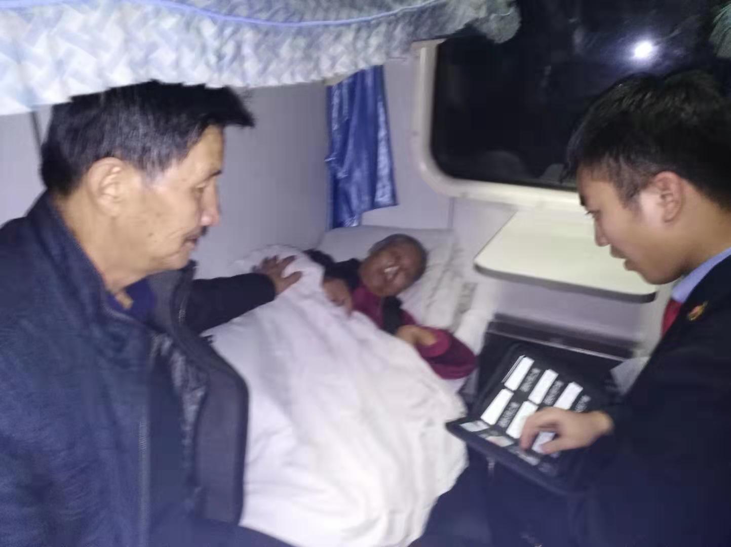 1月23日“春运”开始的第三天,晚上21:05离K8197次列车放行还有一段时间,有两位老人互相搀扶着缓缓的向11车厢走过来,老太太手里还拿着一个氧气瓶,瞬间引起了罗霁霖的注意,罗霁霖提前帮他们把行李提上了11车3号中铺和4号下铺卧铺的位置。