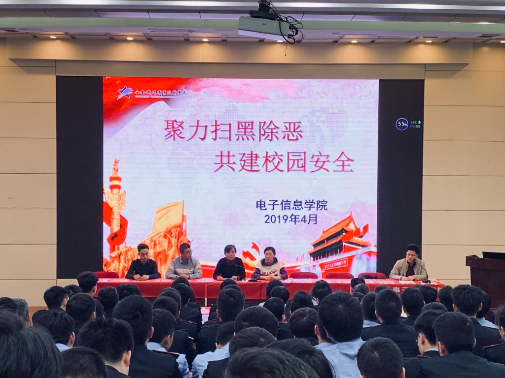 院长孙津平在讲话中指出黑恶势力是社会不稳定因素,影响社会繁荣稳定,倡导同学们积极参与到学校扫黑除恶专项斗争中,强调同学们文明上网,不随意辱骂、威胁他人,不传播谣言,散发言论;在学校中,与同学和睦相处,尊重他人,远离“校园贷”“套路贷”等;不与社会闲散人员交往,远离黑恶势力和不良行为,积极宣传扫黑除恶的相关信息。