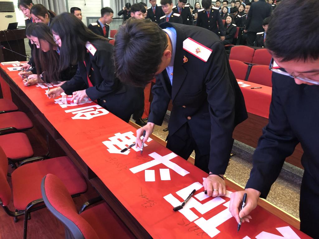铁道信号1802班学生周刚代表全体同学庄严承诺,要严守校规校纪,遵纪守法,做合格大学生,为建设平安校园,构建校园安全贡献一份力量。