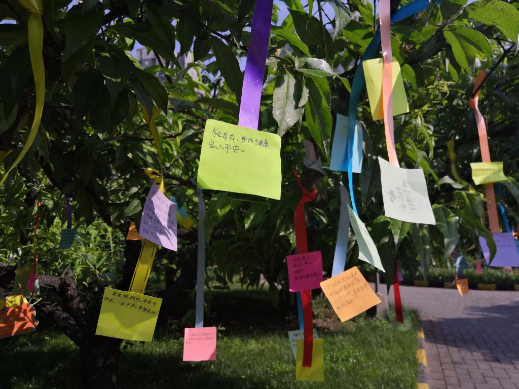午后明媚的阳光撒在詹天佑广场时,同学们将满载祝福的贺卡用彩带装饰于办公楼和教学楼之间的“感恩母亲树”上。一张张独具特色、制作精良的贺卡挂在树梢,引得来往的同学纷纷驻足一起感受这份心意。每一张贺卡上都承载着一个包含着母爱的故事;每一张贺卡上都书写着给母亲饱含深情的情书,这是大家对母亲的感激与爱意。