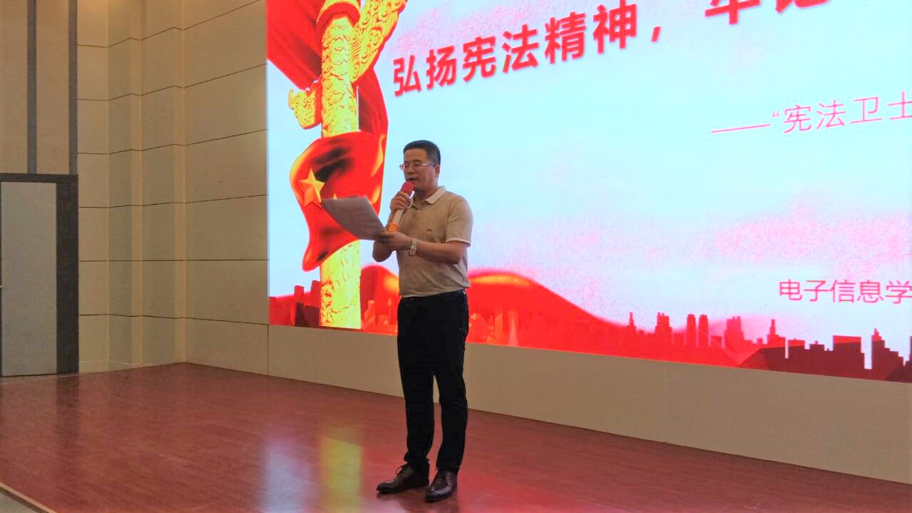 宪法是国家的根本法,是治国安邦的总章程。党的十八大以来,以习近平同志为核心的党中央高度重视宪法在治国理政中的重要地位和作用。为普及宪法知识,弘扬宪法精神,9月5日下午,电子信息学院在阶梯教室举办“弘扬宪法精神,牢记职责使命”“争做宪法小卫士”主题教育活动。参加本次活动的有党总支书记张伟敏、学工办辅导员、班主任和200余名学生。