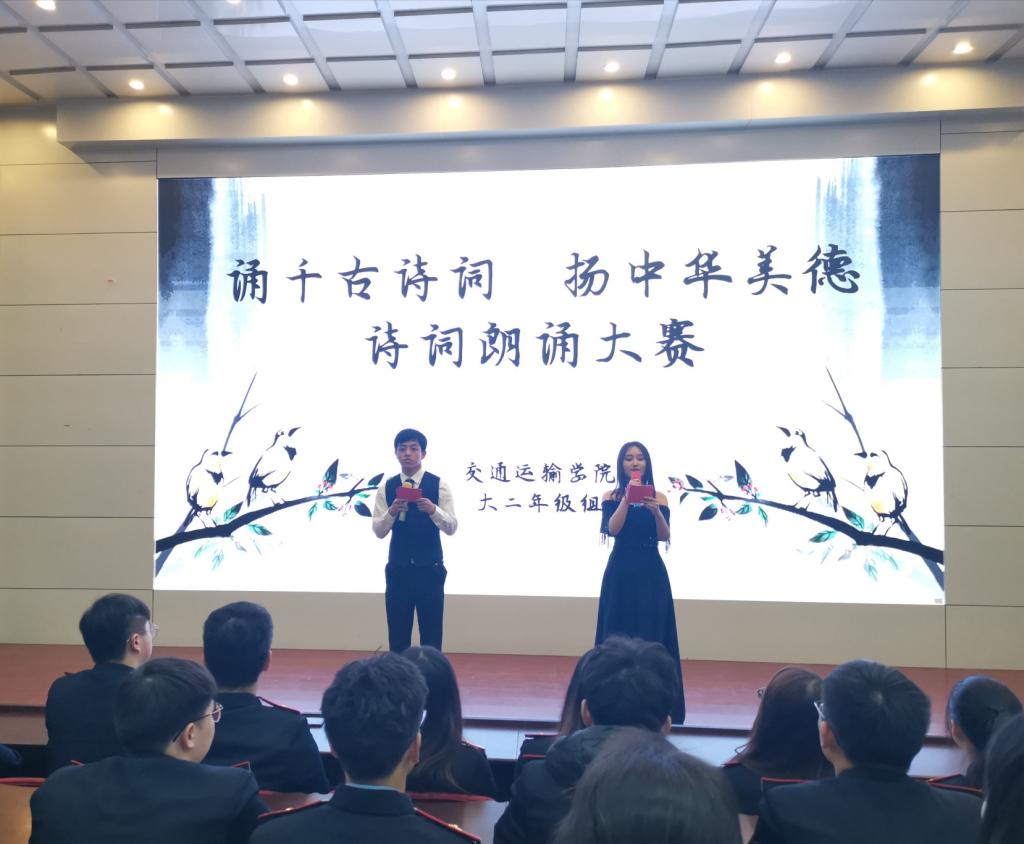 11月20日下午,交通运输学院在自强校区举办“诵千古诗词,扬中华美德”诗词朗诵大赛,比赛由大二年级组承办,学工办全体辅导员班主任参与活动,同时到场的还有大二年级组两百余名学生代表。