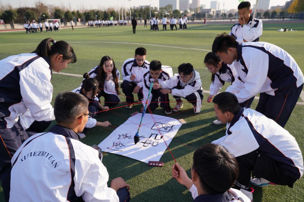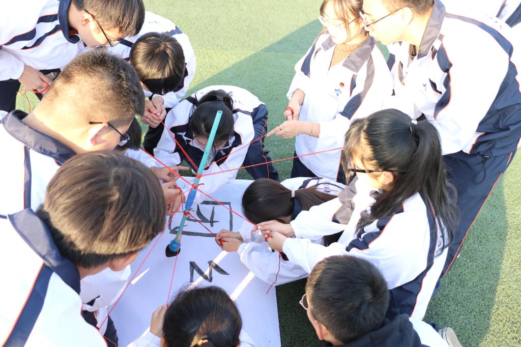 接下来是“神笔马良”,所有学员拉毛笔绳子的末端,所有学员不得接触毛笔的情况下,按照教练的要求完成指定的写字任务,用时最短完成的为胜利方。该项目锻炼的是团队的整体性和配合性,在团队其它成员发生失误时,团队共同想办法补救和解决,才能将字用毛笔完整写出来,为团队目标的实现学会共同调整。