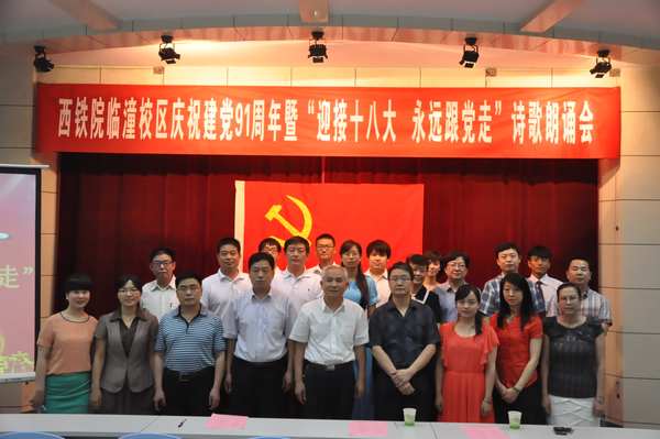 临潼校区在实验楼五楼阶梯教室举办了庆祝建党91周年暨“迎接十八大 永远跟党走”诗歌朗诵会,师生代表以一场主题鲜明、内涵丰富、情感深蕴的朗诵会为建党91周年献礼,也为学院发展前进的主旋律增添了动听的音符。选手们朗诵了《四点零八分的北京》、《母亲河畅想》、《我们不会忘记》、《我的南方和北方》、《苍穹下的唐古拉》和《喊故乡》等十一首经典红色诗歌,赢得了师生们阵阵掌声。