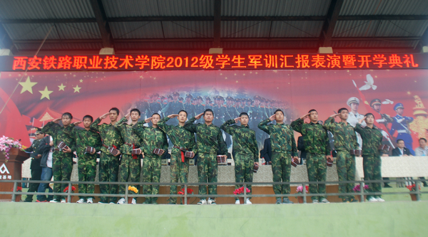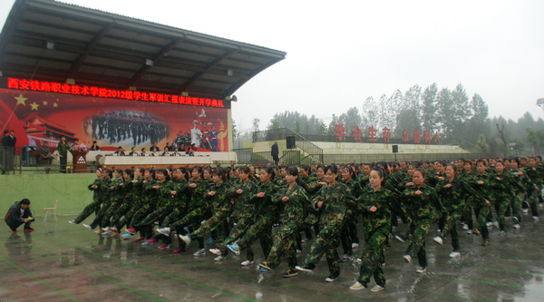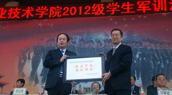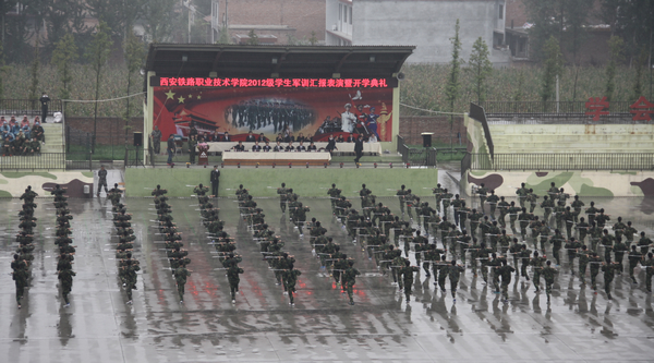 9月25日上午,永利官网2012级新生军训汇演暨开学典礼在西安市教育局国防教育基地隆重举行。学院党委书记安文中、院长田和平、副院长邓耀斌、翁谦锁,西安市教育局国防教育基地书记韩新、基地主任张红星、基地副主任刘登毅及学院各系部处室负责人冒雨出席了大会,大会由龙首校区主任、本次军训学院总负责史艺农主持。