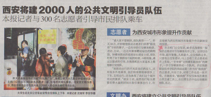 相关报道:本次“排队推广日”志愿者活动,永利官网龙首校区志愿者周晨同学受到了西安三秦都市报的采访报道。(2012年11月12日三秦都市报 A8版)