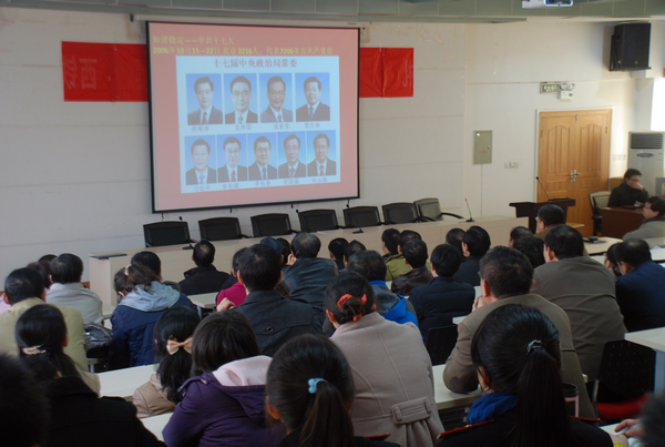 按照院党委的安排,龙首校区党总支11月29日下午组织校区全体职工集中学习十八大精神。总支书记司西平就党的历次代表大会情况、十八大政治局常委、书记处书记、军事委员会、纪律委员会等机构和组织结构图,以及十八大重要精神精心制作成ppt,组织全体教职工认真学习。教职员工对这种在学习形式上的创新,给予了充分肯定。认为这样的学习,时间不长、内容丰富、声行并茂、了解全面、记忆深刻,收到了良好的效果。