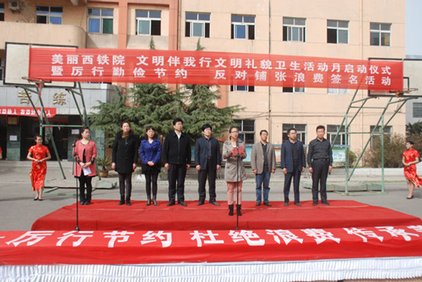启动仪式上,首先由吴领合宣读了活动的实施方案,并要求广大师生高度重视、精心组织、加强宣传、倡导文明礼貌创建美丽和谐校园,引导学生认清铺张浪费的危害,树立节约光荣、浪费可耻的思想观念,在全校区营造良好的活动氛围。接着,学生代表向全体学生发出倡议,最后,郭小莉在讲话中向全体同学们提出三点希望:一是希望同学们积极践行文明礼貌卫生活动月的精神;二是希望同学们珍惜粮食、远离浪费,积极投身于厉行勤俭节约、反对铺张浪费的活动中来;三是希望同学们从身边的小事做起、点滴做起,持之以恒共同创建节约型校园。