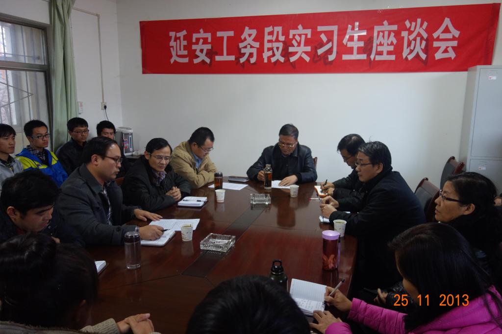 11月25日,延安工务段副段长杨法俊、劳人科长薛林、职教科长王保兵及甘泉车间主任龙荣忠等陪同邓耀斌一行查看了学生宿舍、食堂,召开了在黄陵、富县和甘泉车间顶岗实习的学生的座谈会。段领导和学院领导询问了学生现场实习安排、集训和考证、实习过程中的困难等情况,并解答了学生们的一些疑惑。邓耀斌感谢延安工务段对永利官网实习学生的悉心照顾与安排,转告了学院领导对段领导的感谢。