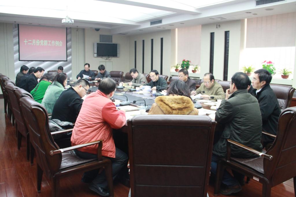 12月17日上午,党委书记安文中主持召开学院十二月份党群工作例会,听取各党群部门和党总支群众路线教育实践活动开展情况的汇报,了解2013年度目标责任指标完成情况,研究部署近期党群工作。