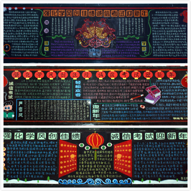 此次板报创作,表达了同学们建诚信校园,树诚信学风,做诚信学子的良好愿望,促使自己以诚信的态度对待每一场考试,以实力去争取优异成绩,以诚信来展现良好学风,为自己大学时代的第一个新年留下珍贵的回忆。(龙首校区)