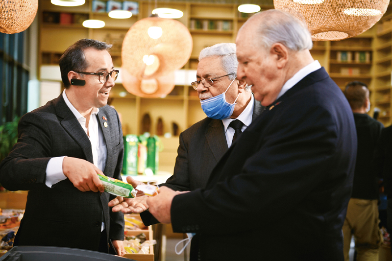 2021年4月15日,由中共中央对外联络部和中共浙江省委共同主办的“中国共产党的故事——习近平新时代中国特色社会主义思想在浙江的实践”专题宣介活动走进浙江安吉,部分国家驻华使节在中方陪同下进行了实地走访。图为当日三位外宾在挑选安吉特产商品。中新社发 臧辰庚/摄