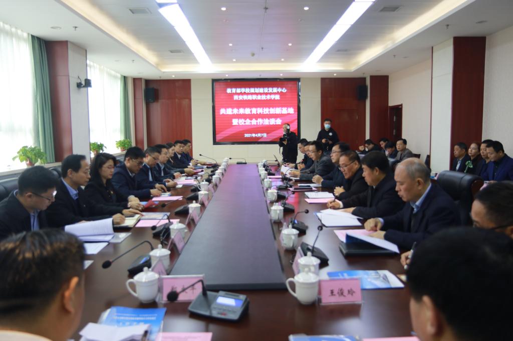 为紧抓“一带一路”、西部大开发、国家中心城市建设等战略机遇,助力西安市争创国家产教融合型城市试点,锻造教育强市建设,打造高素质技术技能人才,加速学院产教融合、校企合作、创新人才培养模式改革,探索建立国家高职院校产教融合发展“西安模式”。4月7日上午,学院与教育部学校规划建设发展中心、省内外行业知名企业在港务校区,隆重举办“产教融合 协同发展”未来教育科技创新基地建设暨校企合作洽谈会,共同研讨科创基地建设、洽谈校企合作项目、谋划学校未来发展。教育部规建中心项目领导,企业负责人、技术团队,学院领导班子、相关部门负责人、专业负责人、专业教师等50余人参加会议。会议由学院党委副书记、纪委书记邓轩主持。