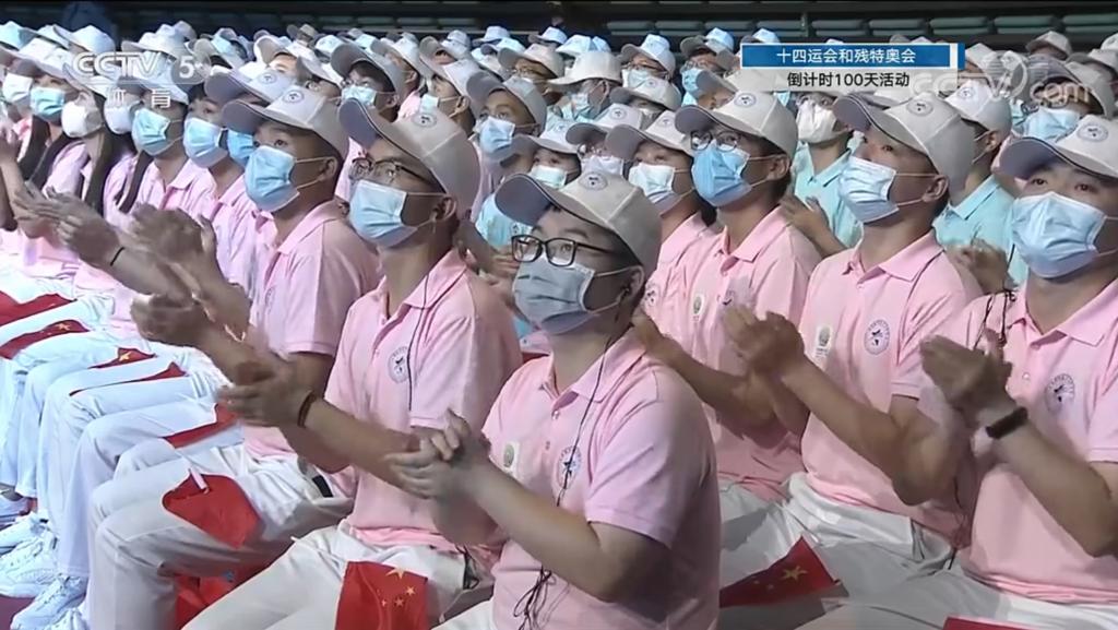 自5月上旬接到承担十四运会和残特奥会倒计时100天活动来,学院领导高度重视,在相关职能部门与各二级学院的通力协作下,完成了300名学生的选拔与培训工作,保障了学生彩排与正式活动的交通、服装鞋帽的设计、学生保险、用餐以及核酸检测等。6月2日起,同学们连续5天在奥体中心进行每天不少于7小时的排练,队形变化、摇旗欢呼、歌曲跟唱等,按照导演组要求圆满完成各项彩排任务,同学们吃着最简单的餐食,露出最灿烂的笑容。