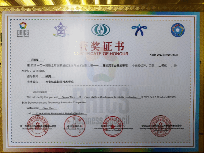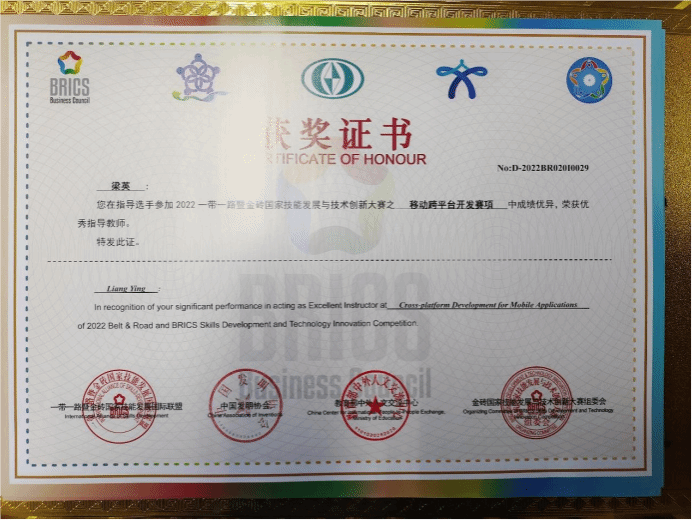在2022年一带一路暨金砖国家技能发展与技术创新大赛移动跨平台开发赛项比赛中,永利官网电子信息学院参赛选手屈明轩荣获二等奖,指导教师梁英荣获优秀指导教师,学校荣获优秀组织奖。